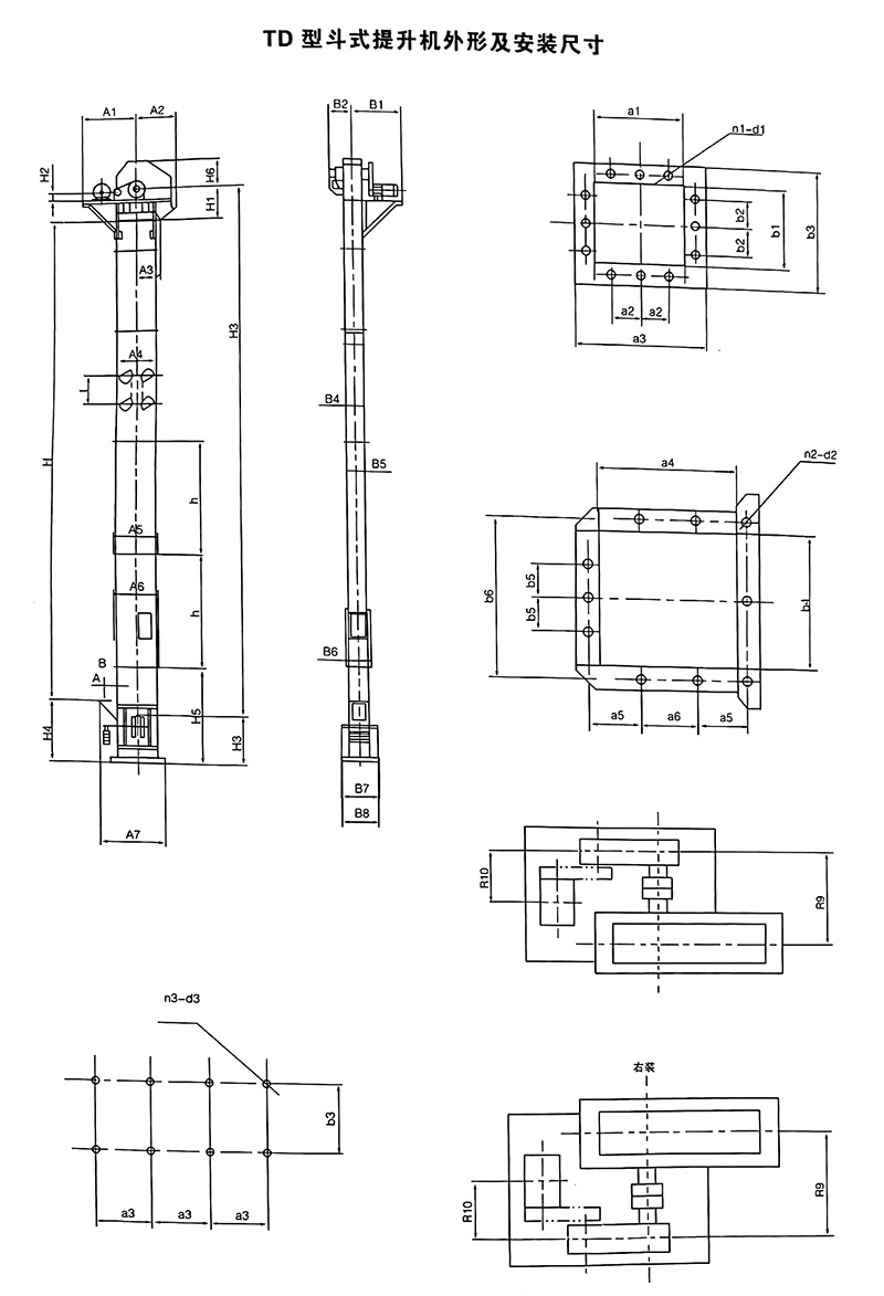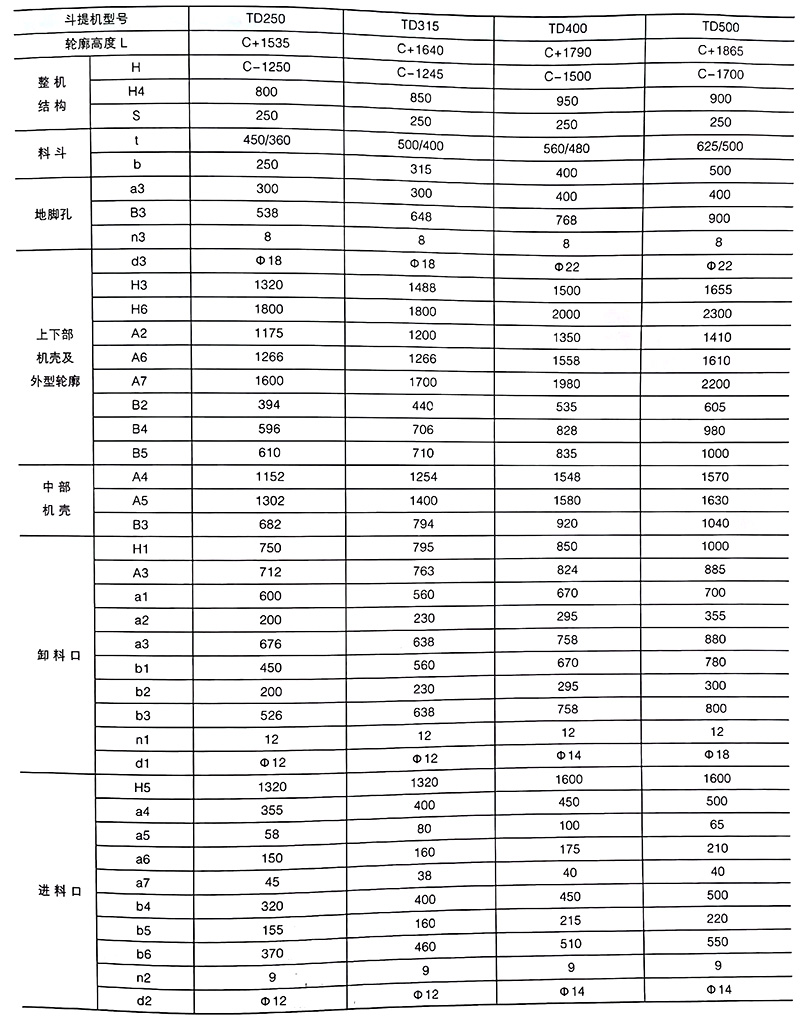 二、主要结构 (1)TD型斗提机结构型式 (2)TD型斗提升机的传动装置有两种形式,分别配有Yz型减速器或ZQ(r)型减速器。YZ 型忒速器直接安装在轴头上,省去了传动平台、联轴器等,使结构紧凑、重量轻、而且其内部带有异型螺逆止器,逆止可靠。该减速器噪音低,运转平稳,并随主轴浮动,可消除安装应力。TD型斗式提升机备有四种料斗Q型(浅斗)、H型(弧底斗)、Zd型(中深)斗)、Sd型(深斗)。
